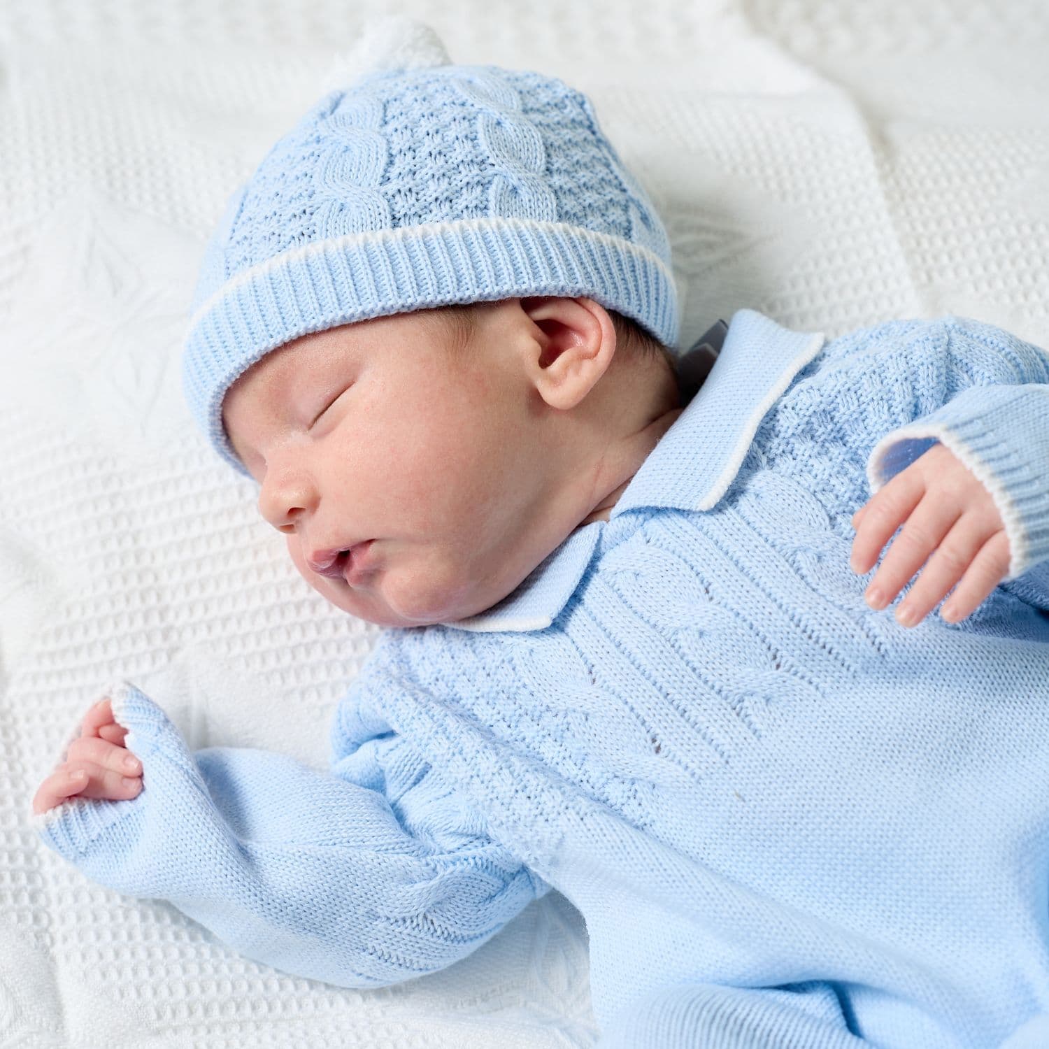 Blue knitted onesie with hat